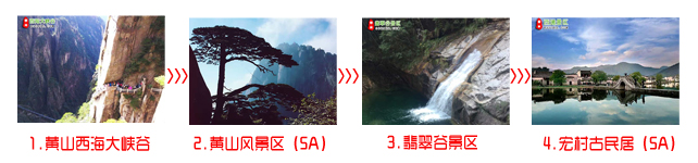 西海大峽谷(第一日下午)--->黃山風(fēng)景區(qū)(第一日)--->翡翠谷景區(qū) (第二日下午)--->宏村景區(qū) (第四日上午)