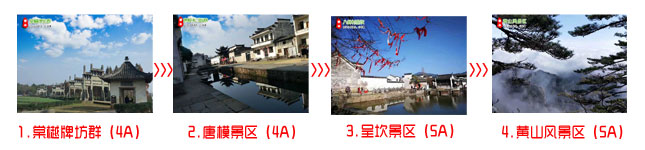 棠樾牌坊群(第二日)--->唐模景區(qū)(第二日)--->呈坎景區(qū)(第二日)--->黃山風(fēng)景區(qū)(第三日)