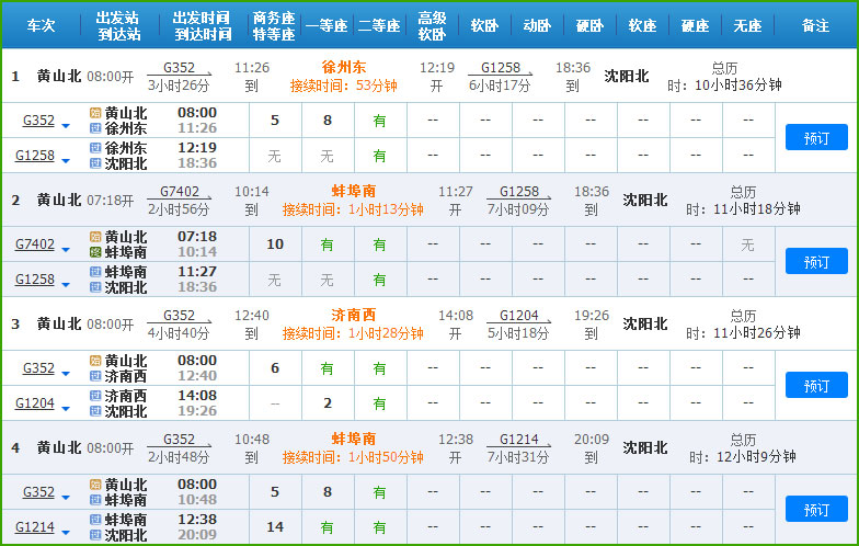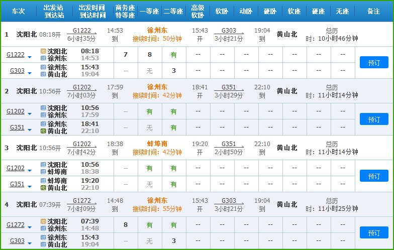 (2)沈陽(yáng)到黃山高鐵列車時(shí)刻表