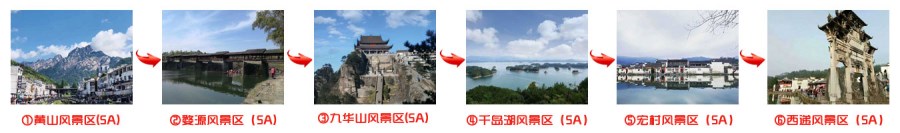 宏村景區(qū) 、 西遞景區(qū) 、 黃山風(fēng)景名勝區(qū) 、 婺源景區(qū) 、 千島湖景區(qū) 、 九華山景區(qū)