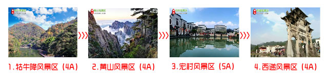 牯牛降風(fēng)景區(qū) 、 宏村景區(qū) 、 西遞景區(qū) 、 黃山風(fēng)景名勝區(qū)
